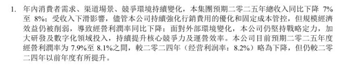 公告显示,因“年内消费者需求、渠道场景、竞争环境持续变化”,蒙牛2025年总收入同比下降7%至8%,经营利润率预计在7.9%到8.1%之间,较2024年同期的8.2%略有下降。但与此同时,归母净利润却从2024年的1.045亿元大幅增长至14亿元至16亿元,增幅超过13倍。